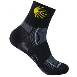 Sie brauchen zum Pilgern mindestens zwei Paar Wandersocken. Auch diese sollten Sie im Fachhandel kaufen. Gute Wandersocken sind nicht unbedingt günstig, aber ein hervorragender Schutz gegen Blasen und sonstige Probleme beim Pilgern. Bei Socken (wie auch bei Schuhen) für den Jakobsweg gilt: Nicht am falschen Ende sparen! Wenn man nicht gerade im Winter wandert, sollten die Socken ganz aus Kunstfaser ohne Wollanteil bestehen. (Baumwolle ist für sportliche Betätigung nicht geeignet.) Außerdem haben Wandersocken an den wichtigen Stellen zusätzliche Polsterungen und sind ohne auftragende Nähte gearbeitet. Bitte mindestens einmal vor dem Pilgern waschen! Wandersocken im PilginoShop